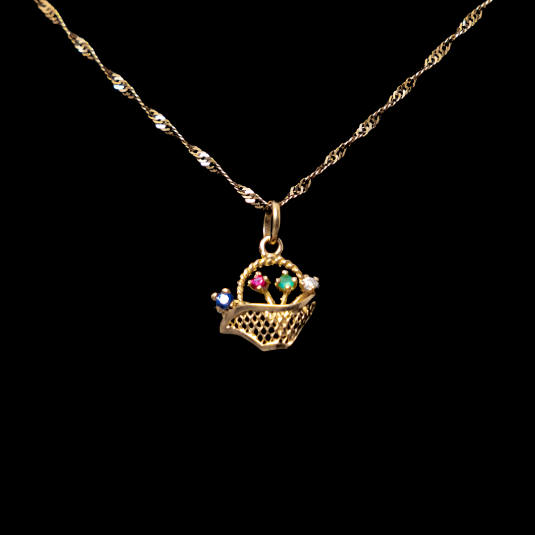 COLGANTE EN ORO AMARILLO DE 18KT CON MOTIVO DE CESTA CON PEQUEÑAS PIEDRAS DE COLORES. 0.8GR0