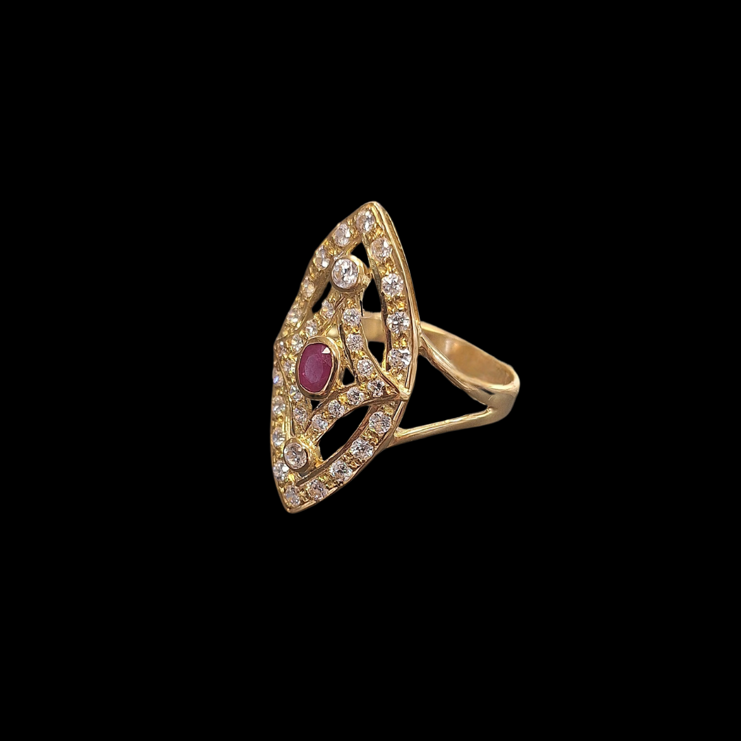 LANZADERA CIRCONITAS PIEDRA CENTRAL ROJA EN ORO AMARILLO DE 18KT, TALLA 18, 4GR.