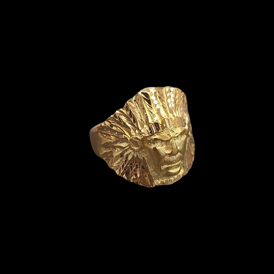 SELLO DISEÑO INDIO TALLADO EN ORO AMARILLO DE 18KT, TALLA 27, 13.4GR